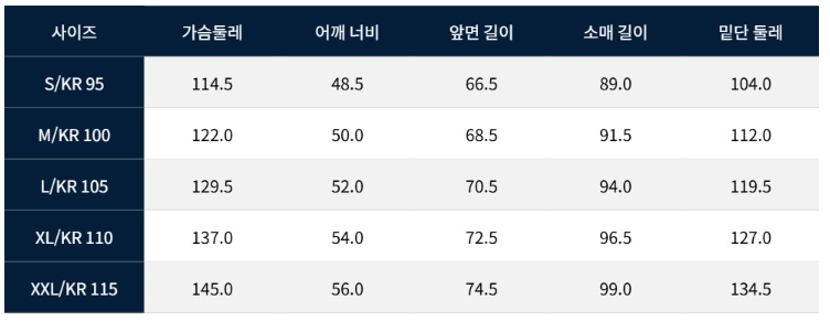 - M 사이즈 앞면 바디 길이 – 68.6cm, 뒷면 바디 길이 – 67.3cm, 숄더 – 50.2cm, 체스트 – 121.9cm, 소매 길이 – 91.4cm, 소매 길이는 목 뒤편 중앙에서부터 측정